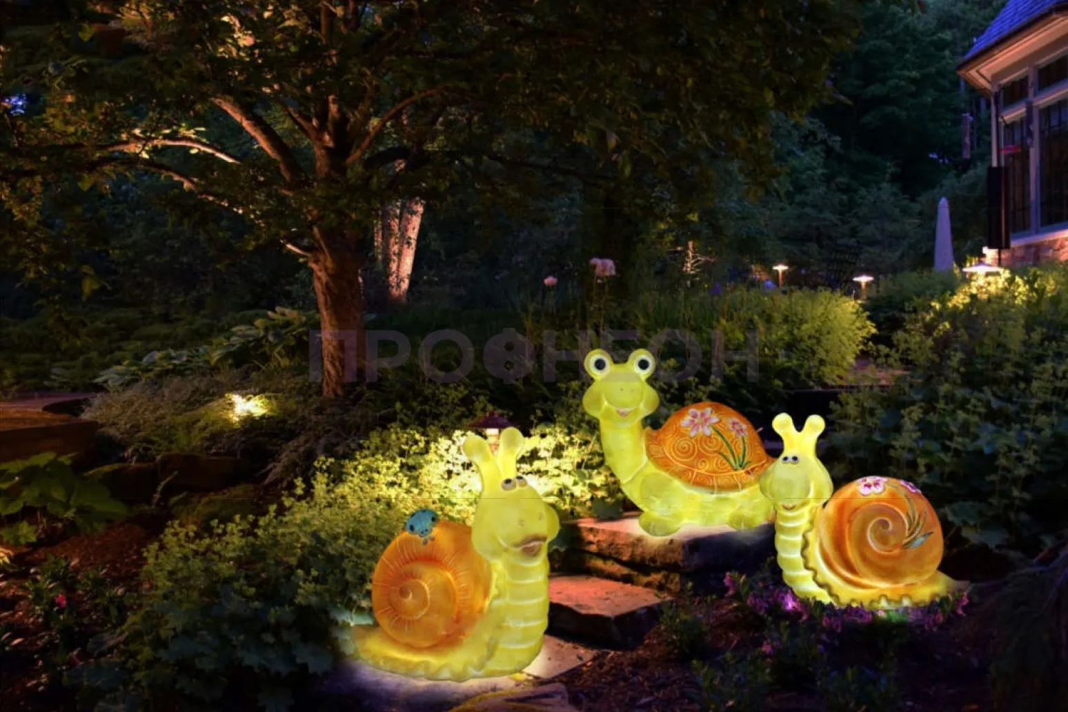 Еще одно интересное решение подсветки для фонтанов и декоративных прудов – светящиеся светодиодные фигуры. Они изготавливаются из экструдированного прозрачного акрила или стекловолокна, внутри которого размещаются светодиоды. Благодаря влагозащищенным трансформаторам 220/24 В можно не переживать, что такие изделия выйдут из строя, если попадут под дождь.